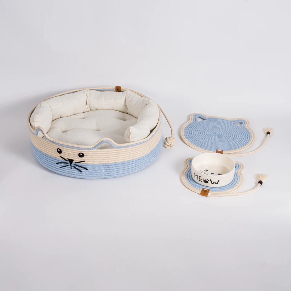 - Pack coordonné : panier, tapis et gamelle assortis pour créer un joli coin dédié à votre chat.