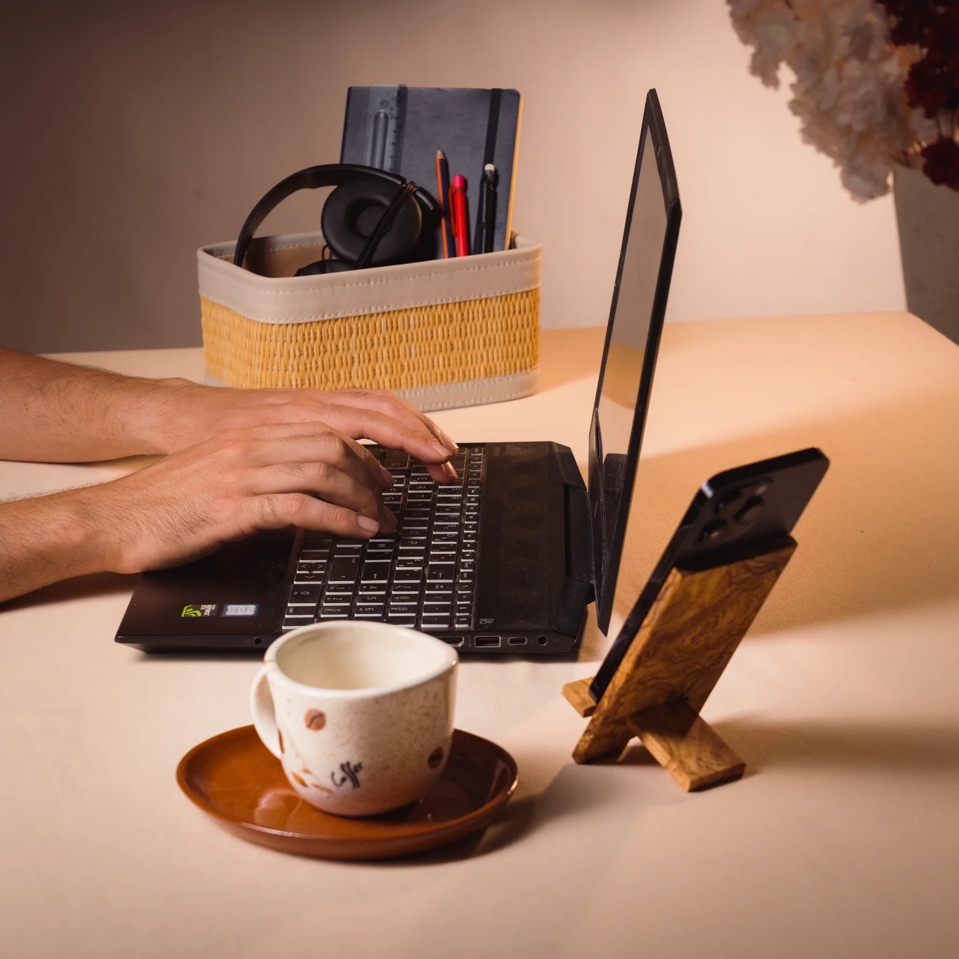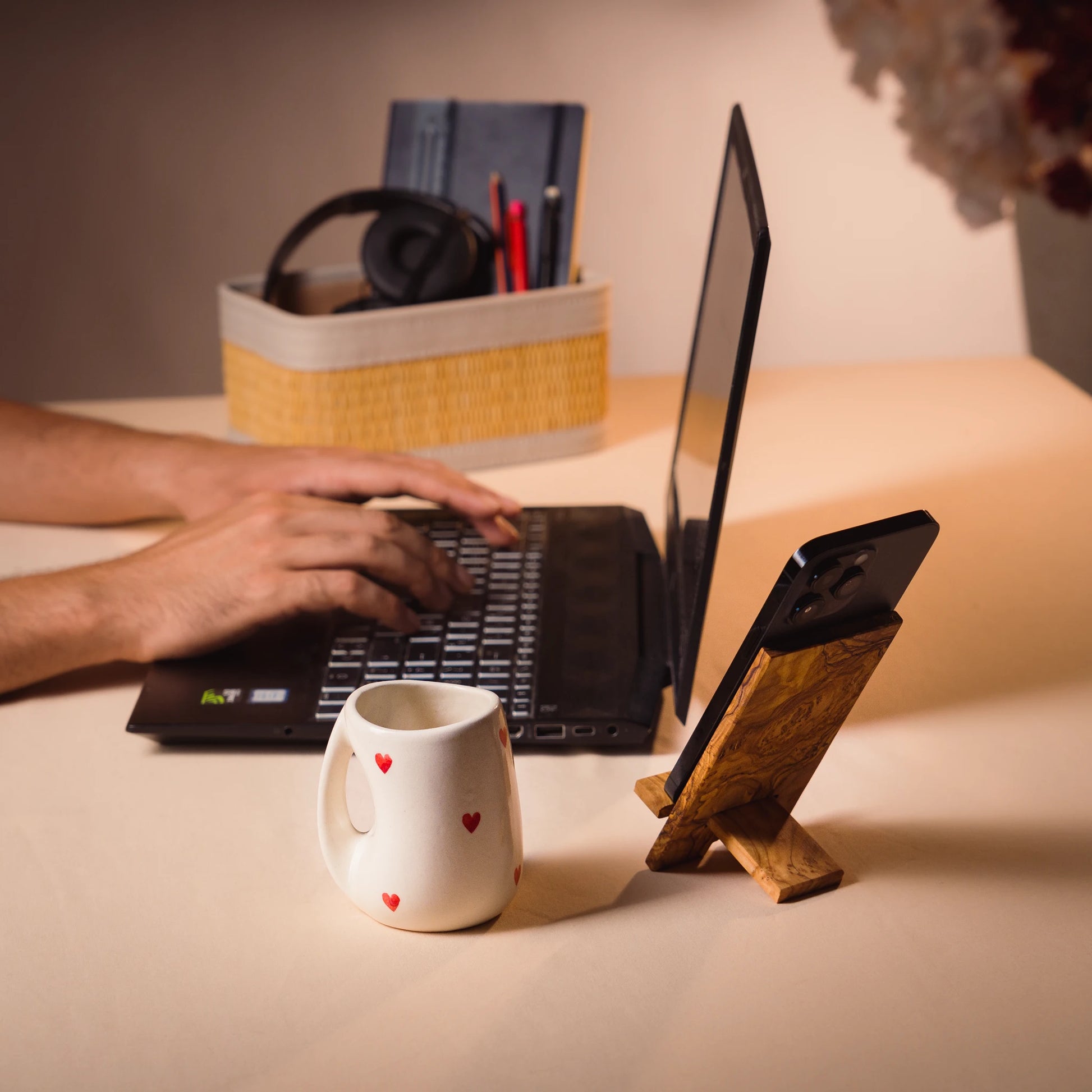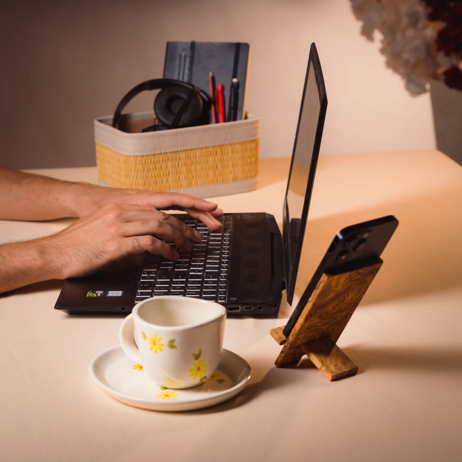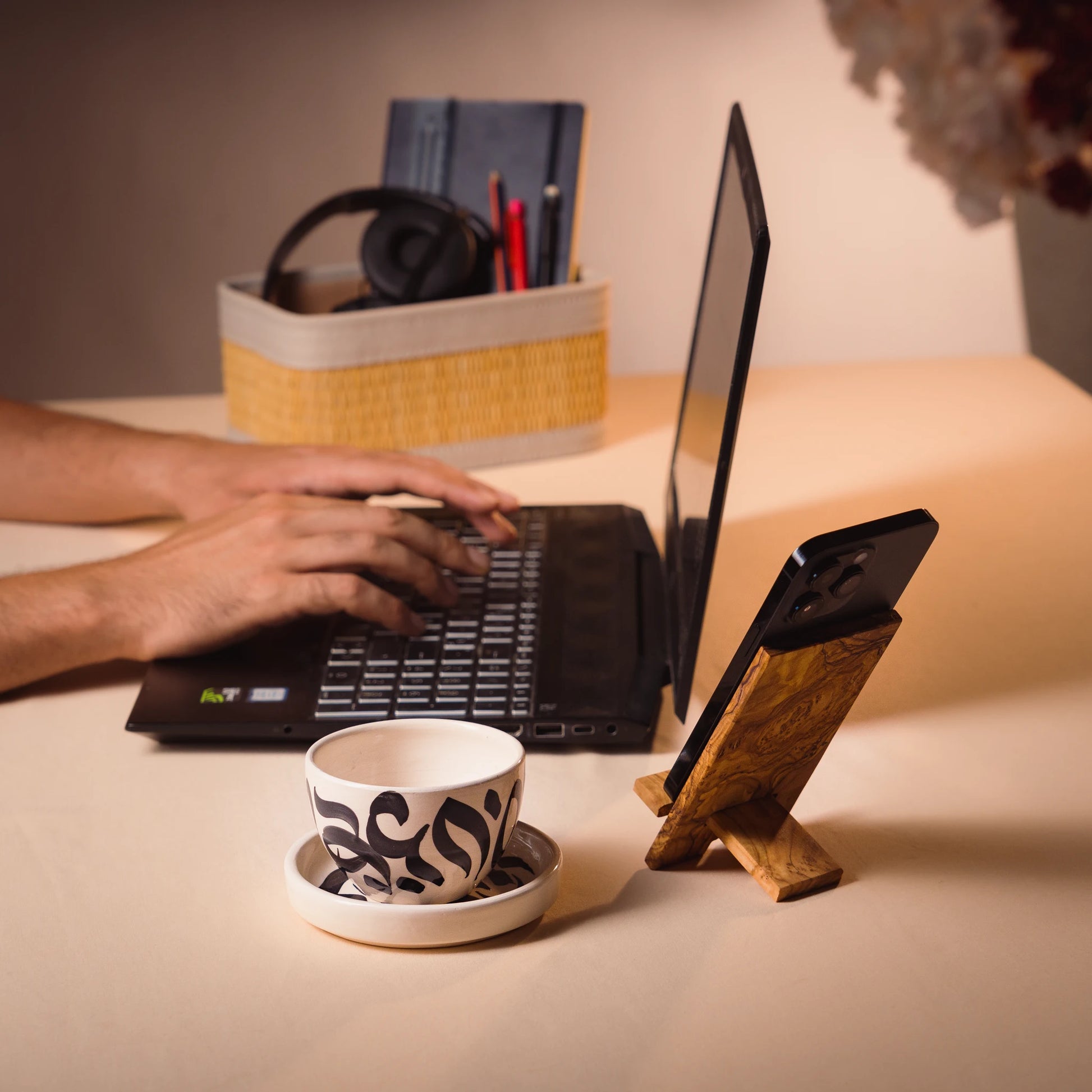 - Un support de téléphone en bois d’olivier (Ecostand) – Élégant, robuste et écologique, conçu à partir de bois d’olivier tunisien connu pour sa durabilité et ses veines uniques. Un indispensable pour poser votre smartphone lors des cours, du travail ou du divertissement.