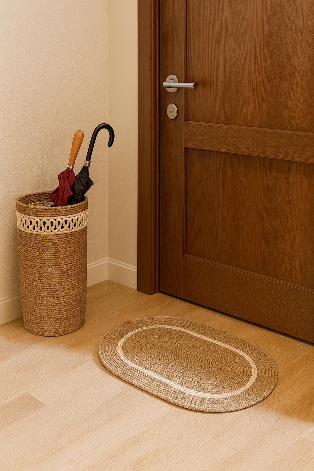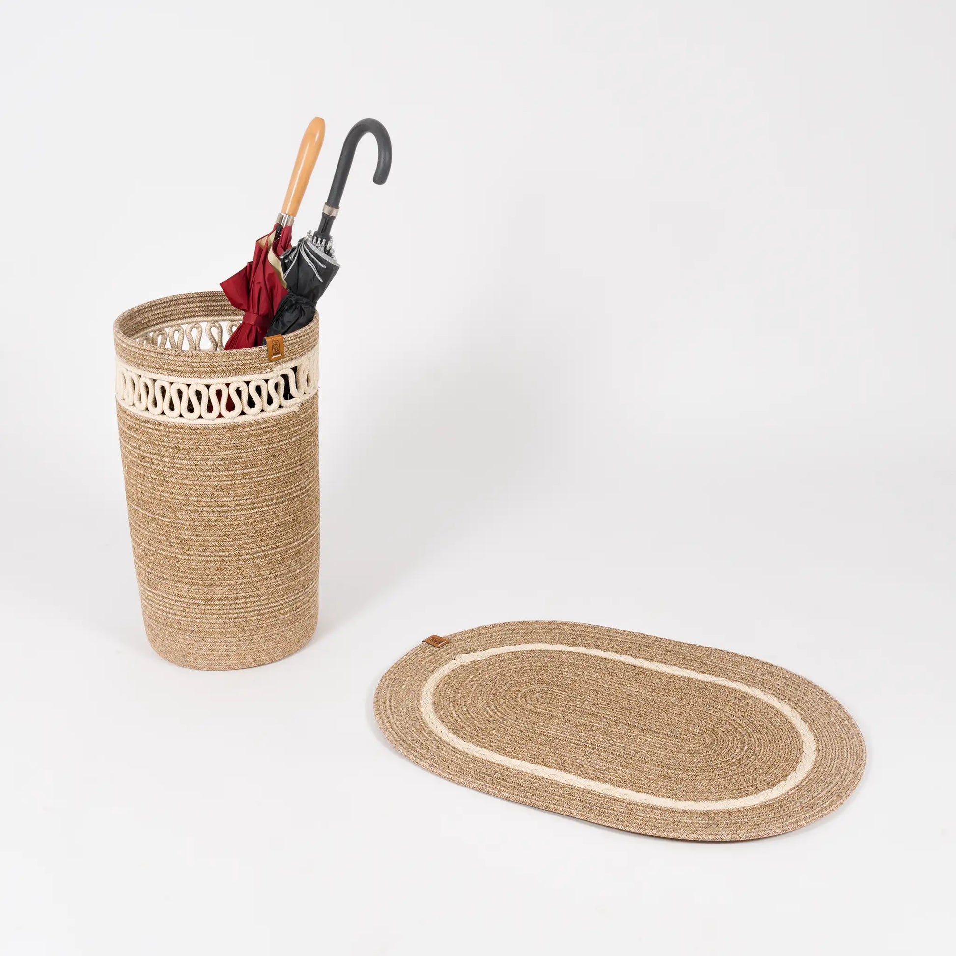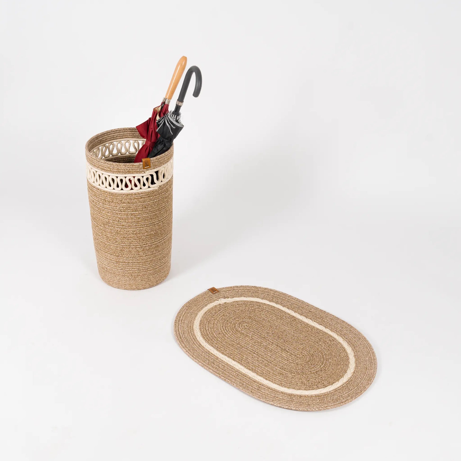Apportez une touche d’élégance naturelle à votre entrée avec notre ensemble artisanal fait main, composé d’un porte-parapluies raffiné et d’un tapis d’entrée assorti en fils tressés.