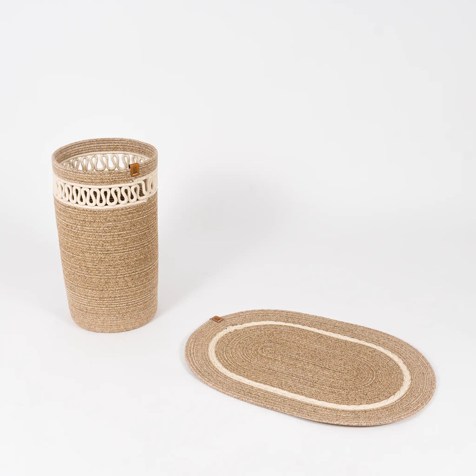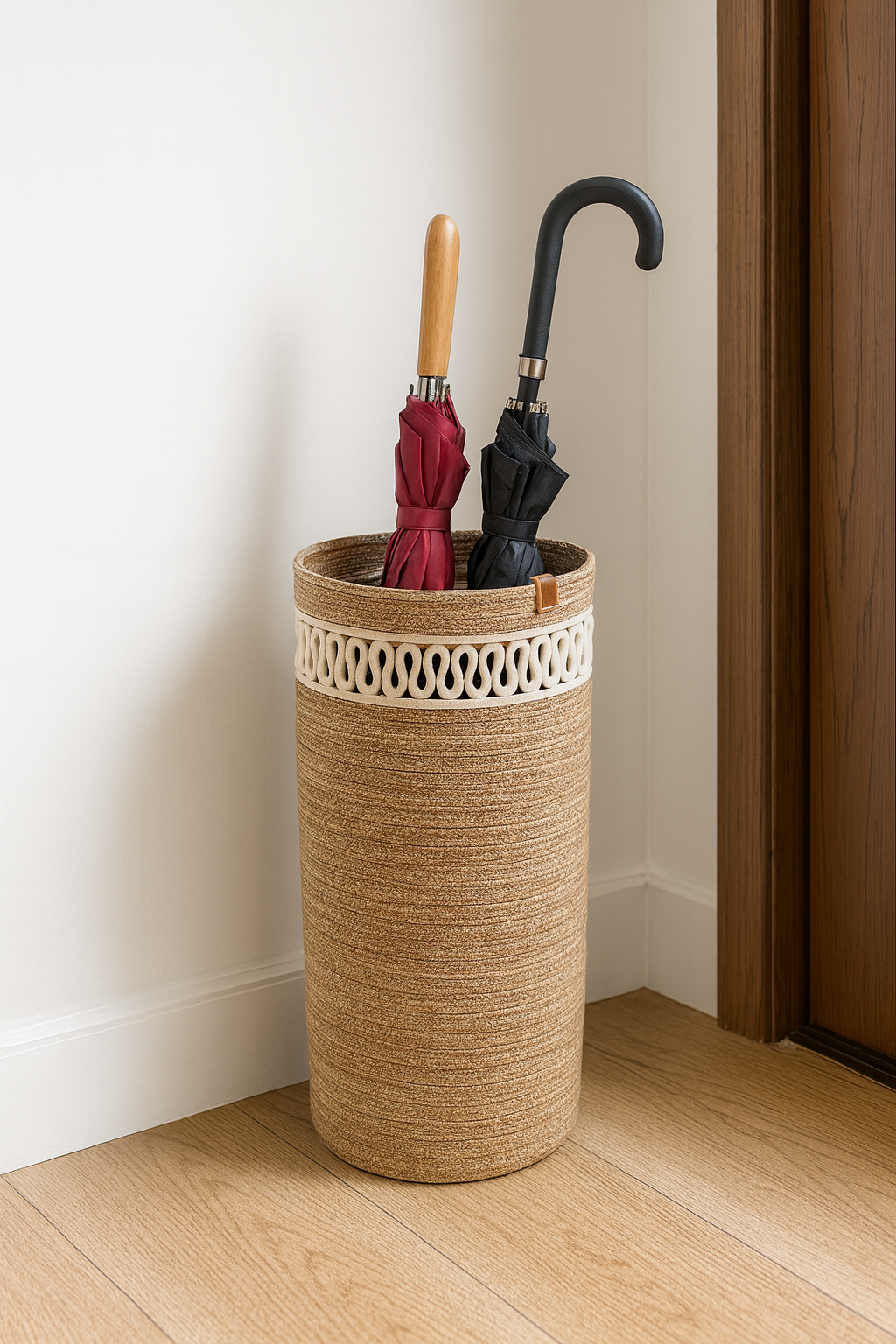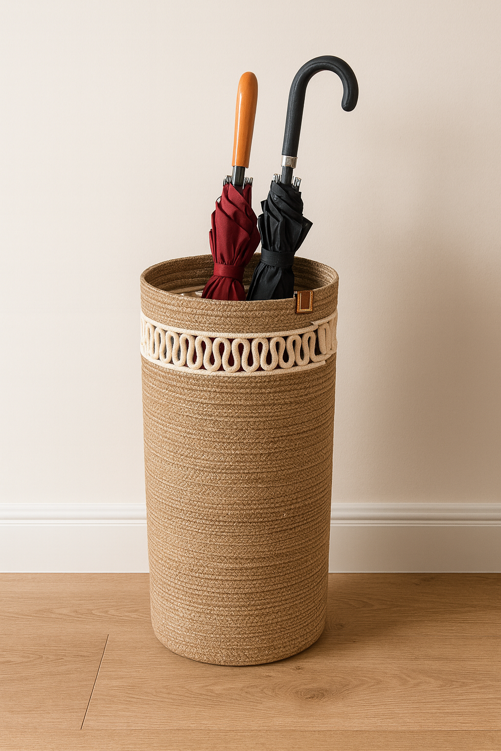 Apportez une touche d’élégance naturelle à votre entrée avec notre ensemble artisanal fait main, composé d’un porte-parapluies raffiné et d’un tapis d’entrée assorti en fils tressés.