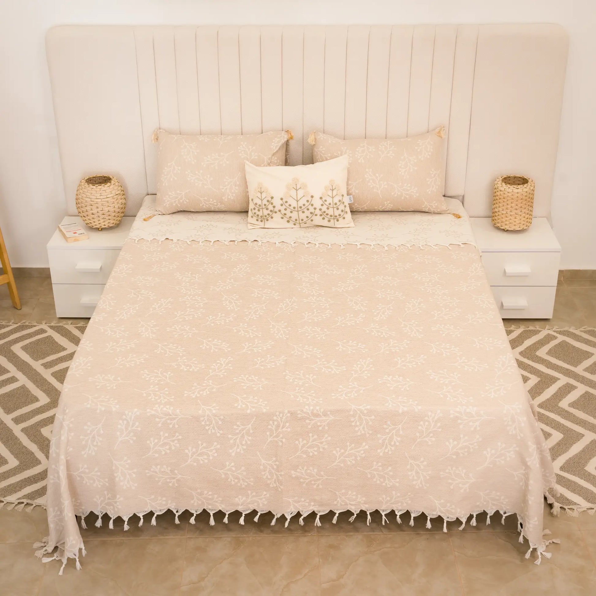 Son motif floral délicat, associé à des tons beiges apaisants, crée une atmosphère harmonieuse et moderne, idéale pour les chambres minimalistes, scandinaves ou boho chic. Conçue en coton de haute qualité, cette parure allie confort, esthétique et durabilité.