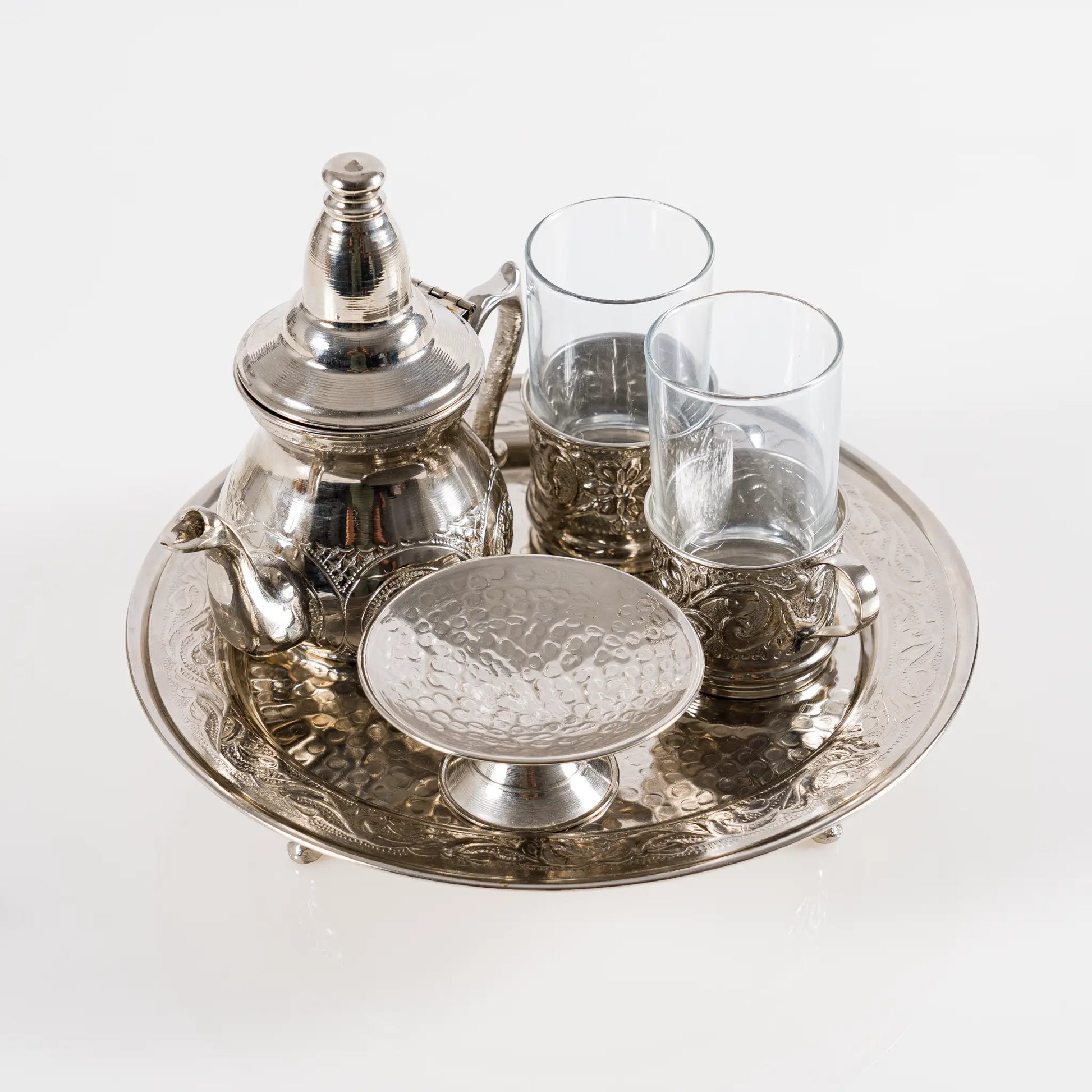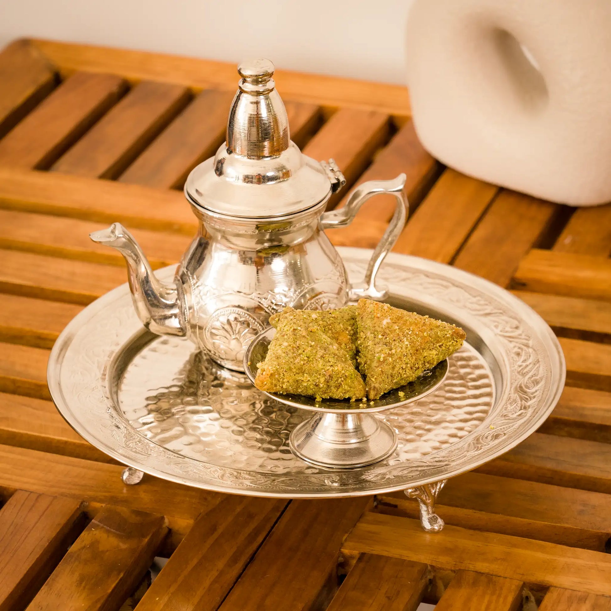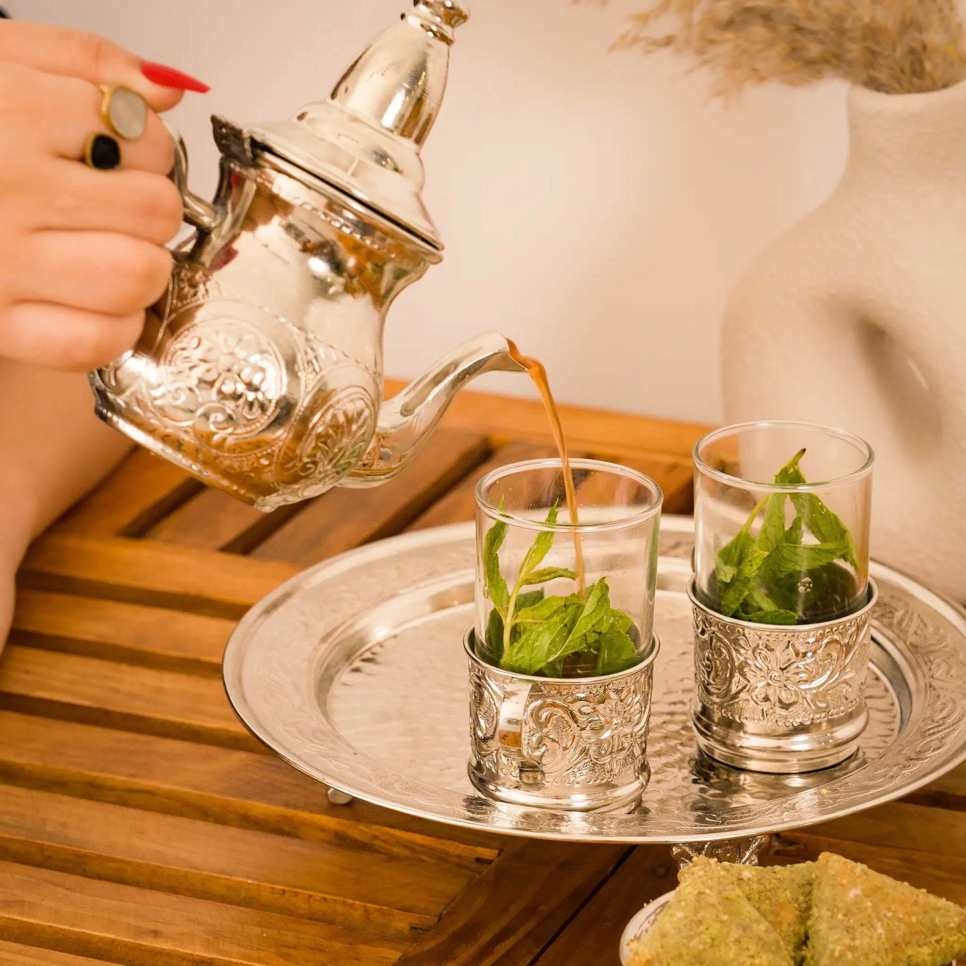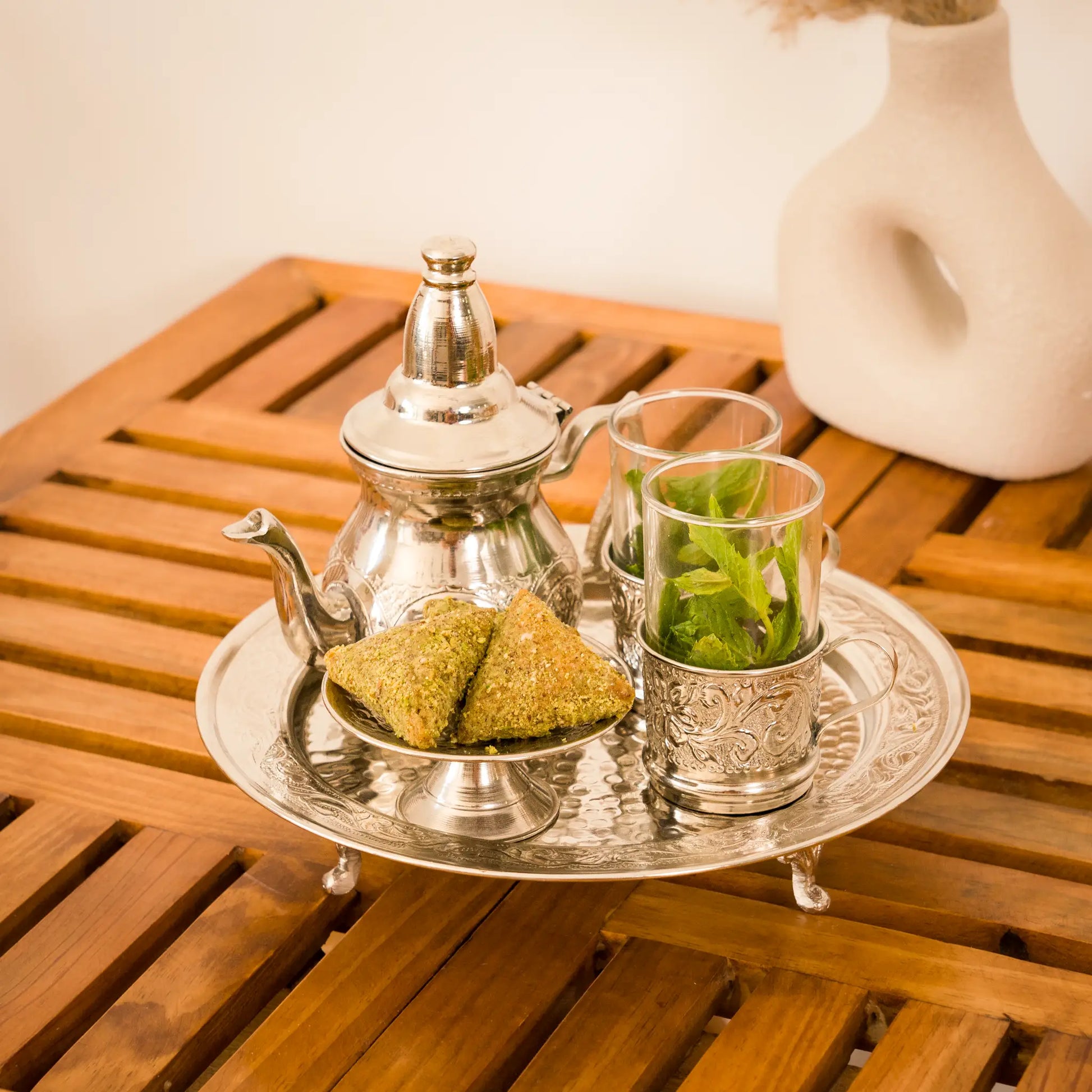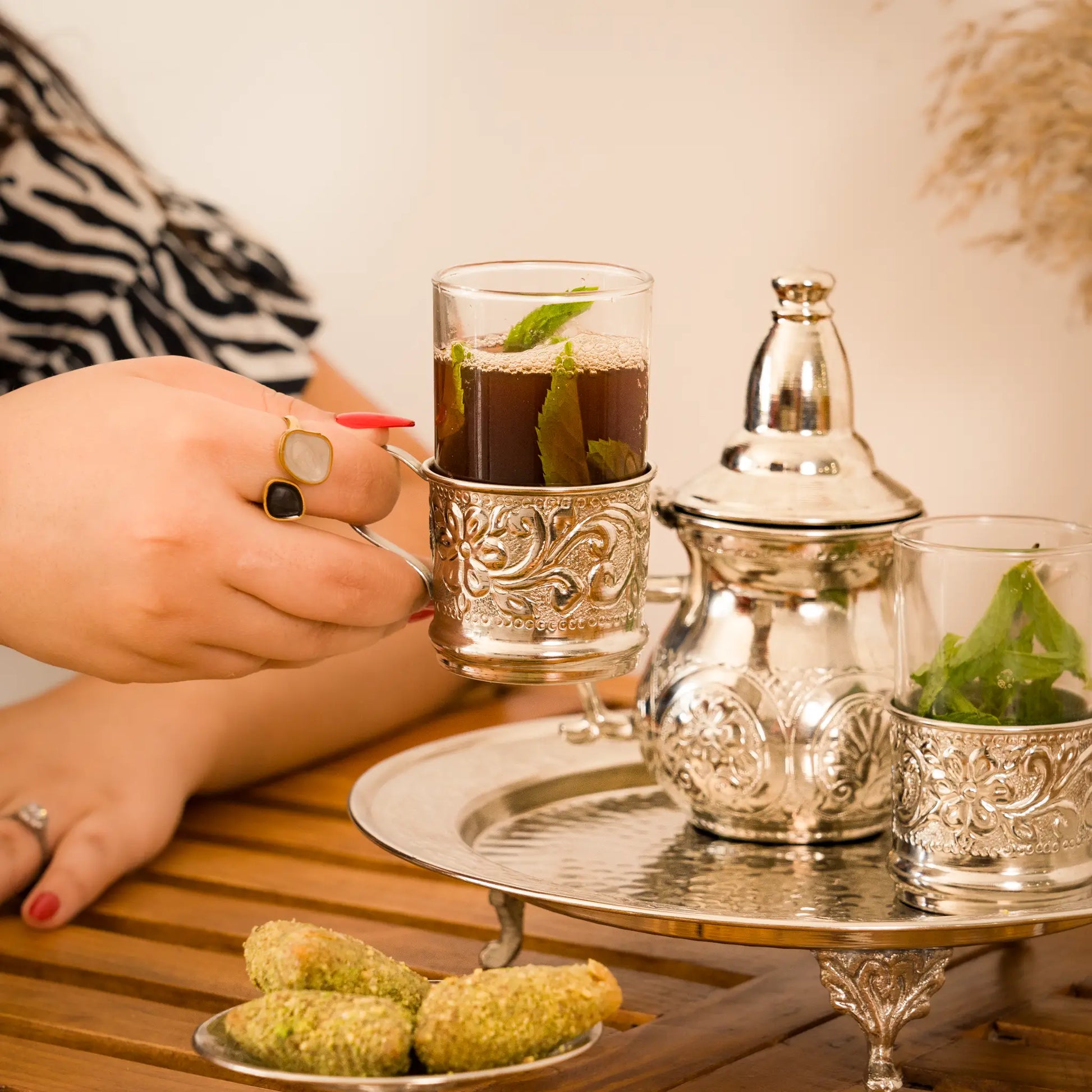 Offrez à vos instants de thé une touche d’élégance et d’authenticité avec notre pack Dar El-Louz, un service à thé artisanal en cuivre martelé et gravé. Conçu par nos artisans tunisiens, ce set allie tradition, raffinement et durabilité, pour transformer chaque pause thé en une véritable cérémonie