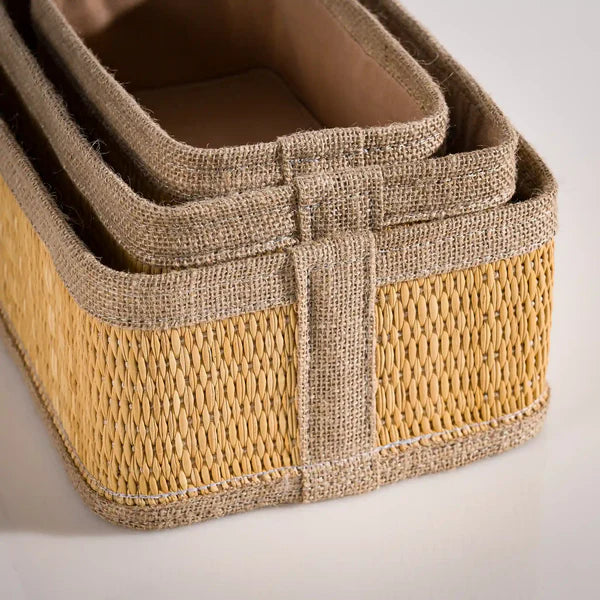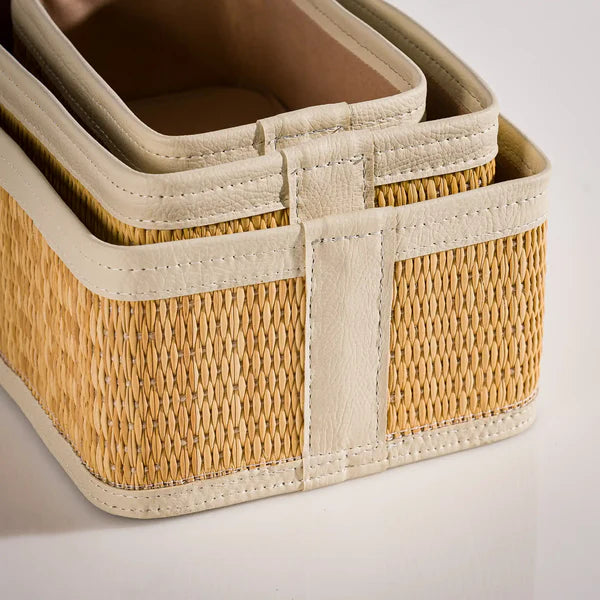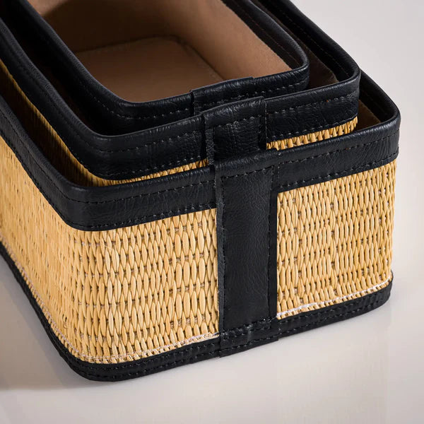 Ces trois paniers sont un ajout remarquable à votre décoration intérieure tout en répondant à vos besoins de rangement. Leur design comprend des bandes de cuir et une doublure en tissu TNT pour une protection accrue.
