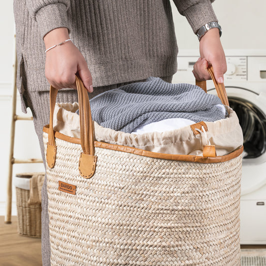 Panier à linge en Saaf avec fermeture - Cuir couleur Camel - H55 x ∅45cm - Fait Main